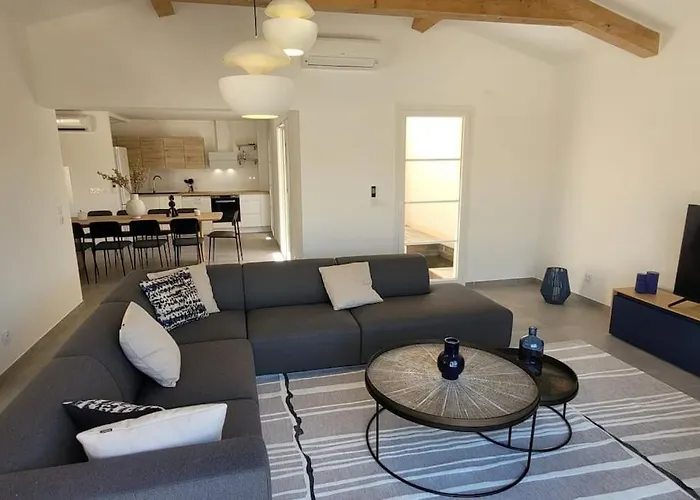 300 M De La Plage, Piscine Clim, Wifi ligger 1 km fra Grimaud Havn og repræsenterer en 5 værelsers indkvartering med en terrasse. Denne villa indeholder kaffe- og tefaciliteter, et skrivebord, et fladskærms TV med satellitkanaler og et fuldt udstyret køkken med en mikrobølgeovn, kaffemaskiner/tekedler og et køleskab.